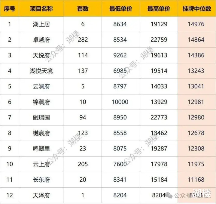 ②二手房(不含别墅)挂牌的中位数价格,最高的是湖上居。